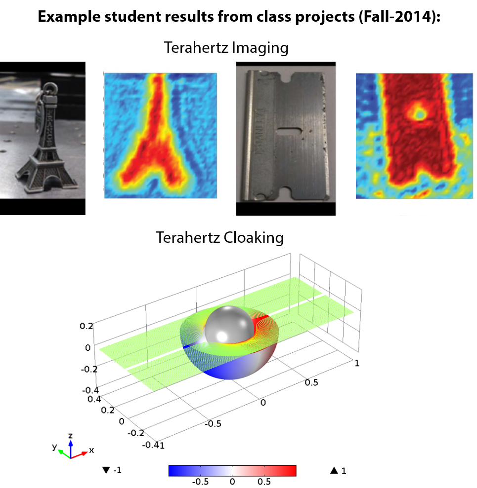 Interactions of terahertz waves with matter. Gaussian beam propagation. Gaussian beam transformations. Refractive and reflective focusing elements. Frequency independent quasi-optical components. Frequency selective quasi-optical components (planar structures and thick structures). Generation and detection of broadband terahertz pulses (pulse propagation in linear and dispersive media, femtosecond lasers, terahertz time domain spectroscopy, photoconductive antennas, optical rectification, free-space electro-optic sampling, ultra broadband terahertz pulses). Continuous wave sources and detectors (photo-mixing, difference frequency generation, frequency multiplication, quantum cascade lasers, thermal detectors, diode detectors). Terahertz systems and applications.